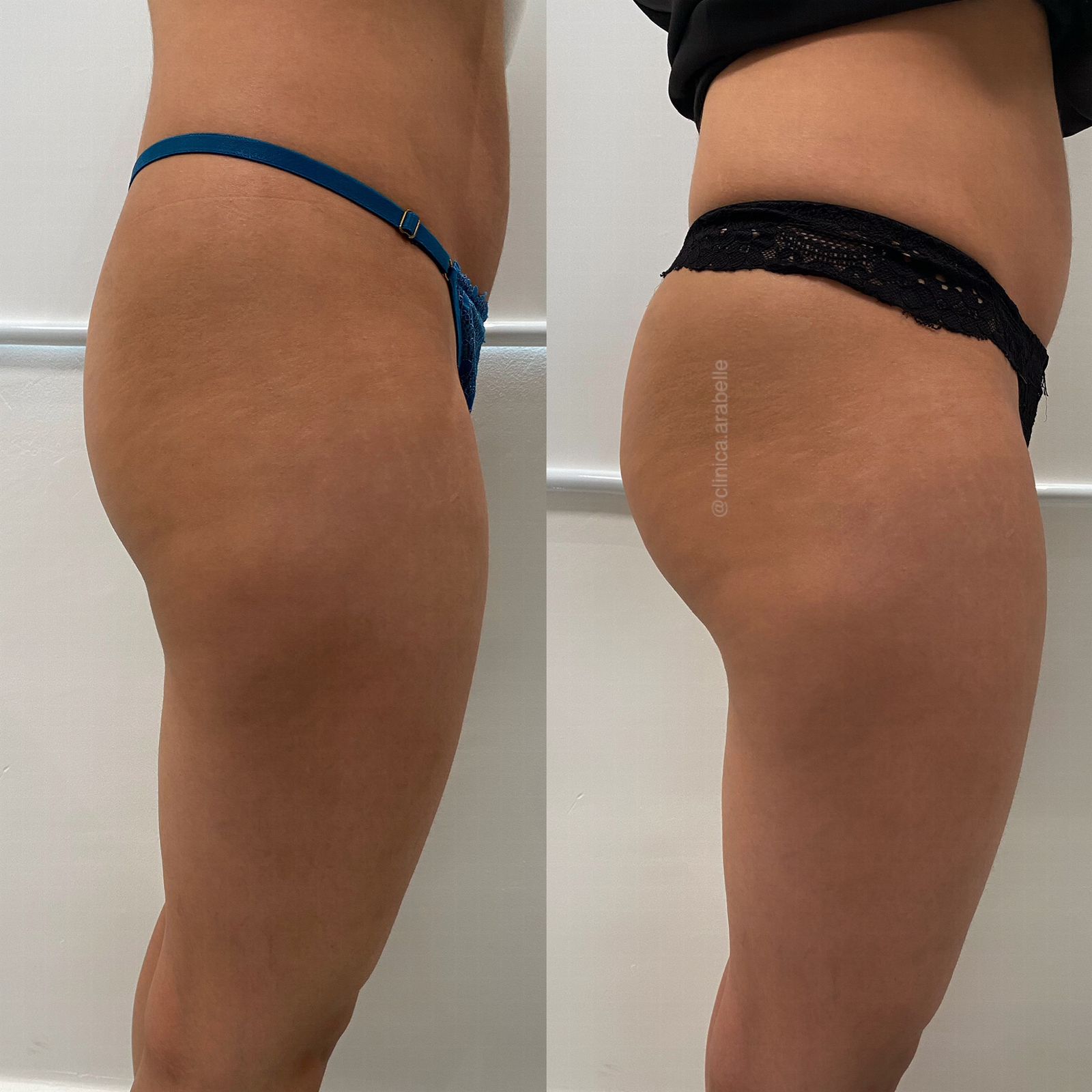 Os produtos mais utilizados para o preenchimento corporal são o ácido hialurônico e a hidroxiapatita de cálcio que são efetivamente voluminadores, mas o Sculptra também pode ser usado pois como ele promove estímulo de colágeno ganhamos espessura dérmica e consequentemente volumização da região.